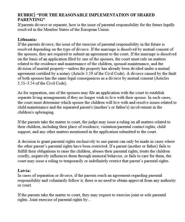 RUBRIC: “FOR THE REASONABLE APPLICATION OF SHARED PARENTING” If parents divorce or separate, how is parental responsibility legislatively resolved for the future in the member states of the European Union